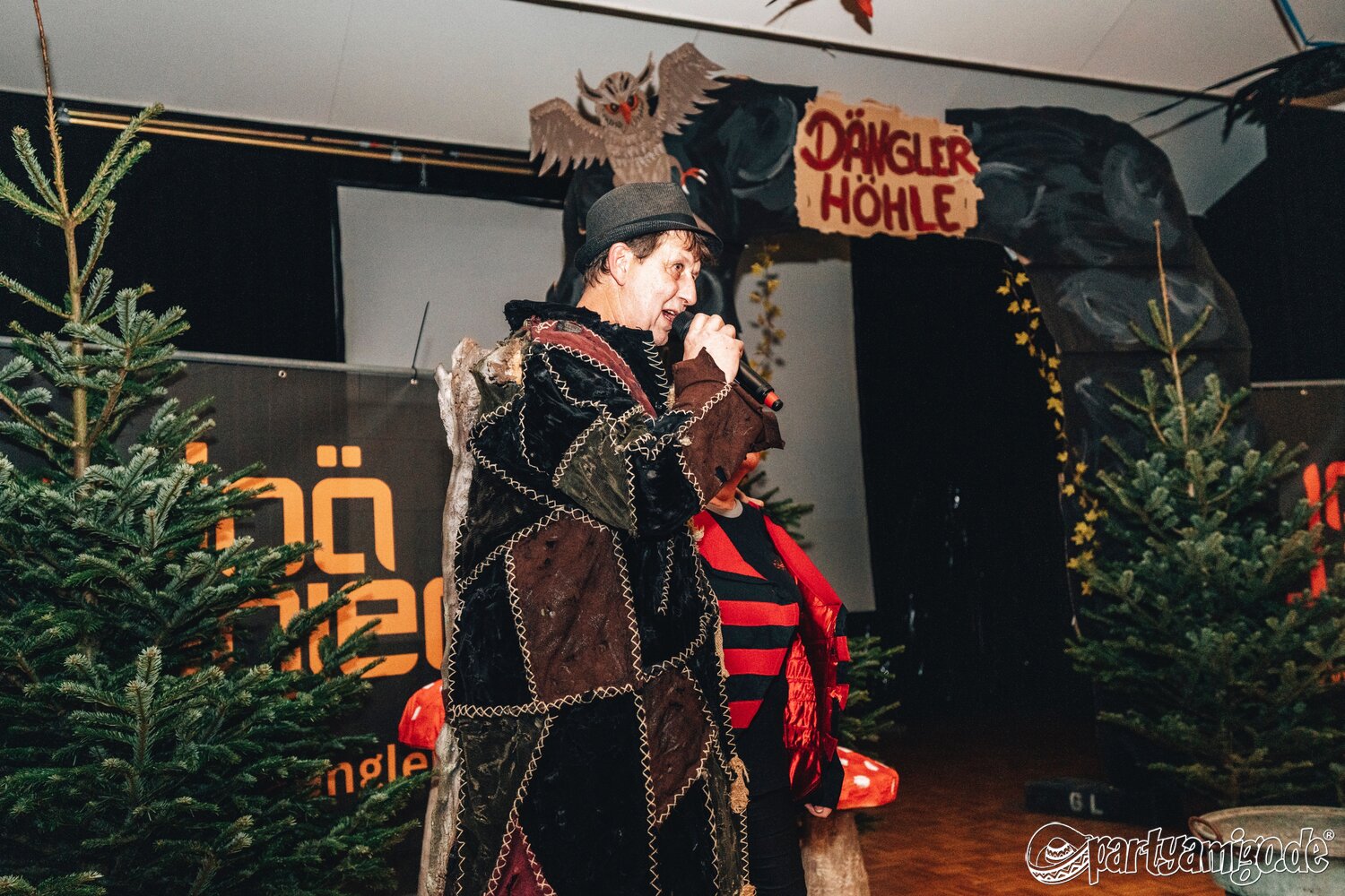 Aus der dunklen Dänglerhöhle im mystischen Wald, welcher aufwendig auf der Bühne dekoriert wurde, trat der Horrorkobold unter dramatischer Musik mit seinen leuchtenden Augen zwischen den Nebelschwaden hervor. Er präsentiert sich im schicken Gewand mit Hemd und Weste. Auf seinem angsteinflößenden grünen Kopf, mit großen Zähnen und den typischen Koboldohren trägt er einen Hut, verziehrt mit allem was er in seiner Waldhöhle angesammelt hat.